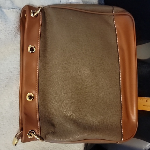 brown handbag. with shoulder/ handle straps. Roughly 12in wide, 10in tall and 3 in wide.