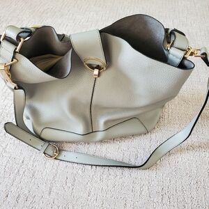 beautiful gray topshop bag , almost new, used literally couple of times, no flaws, crossbody straps, very chic gold metal embellishments. bag is man-made leather.