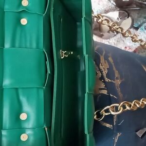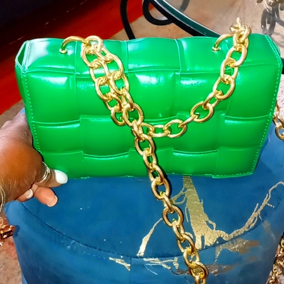 Green handbag--can be used as cross body, or hand carry. Dress up or down. Gold chain straps. Fun. fun.