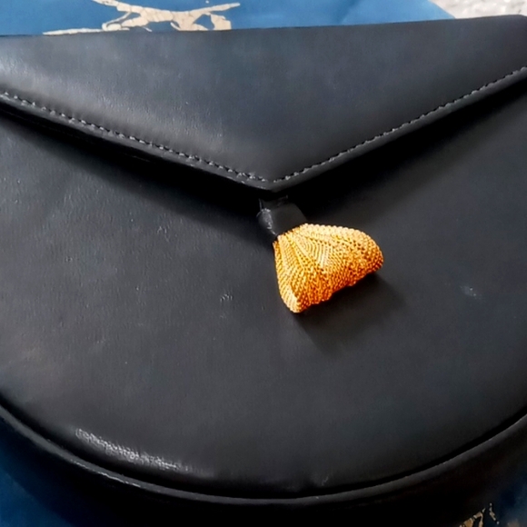 Gently used black leather bag with gold macramé strap.