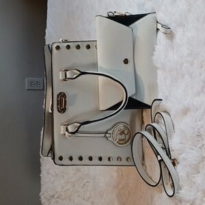 Gently used (1 time only) White with gold stud detail Top handle handbag with shoulder strap and matching wristlet