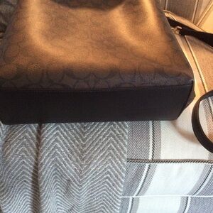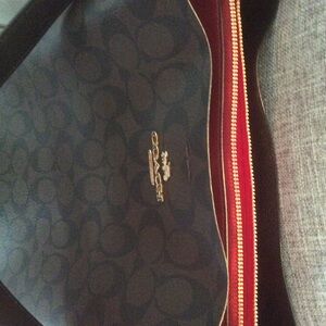 Coach bag brown with black “c’s “, only carried once, excellent condition, has 21 in strap with 45 in shoulder strap included, 12 in high, 13 1/2 in wide, red interior, zippered middle section, also has magnetic closure. Non-smoking home.