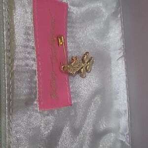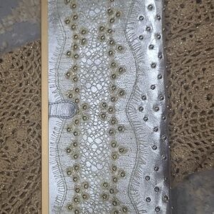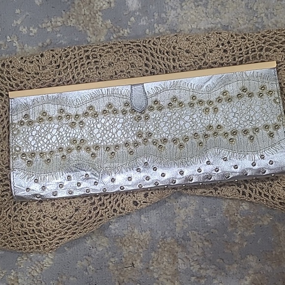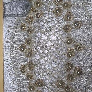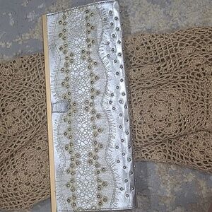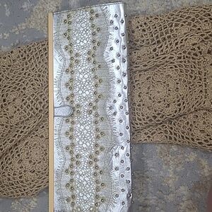 This clutch bag is vegan leather with lace and gold studs. It has a pink interior, which is spacious for your essentials. It is a silver metalic and gold combination. This bag is new without tags.