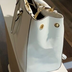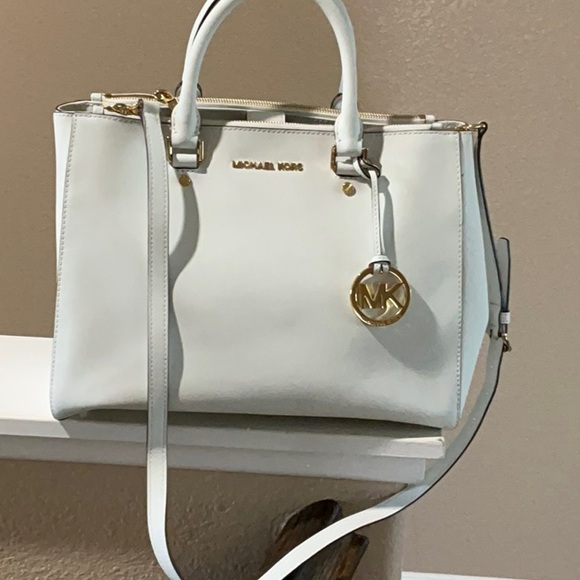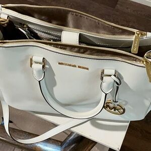 White Michael Kors handbag comes with a shoulder strap. Crossbody strap has about six different compartments. This bag is like new was kept in dust bag and never use maybe once. Very clean