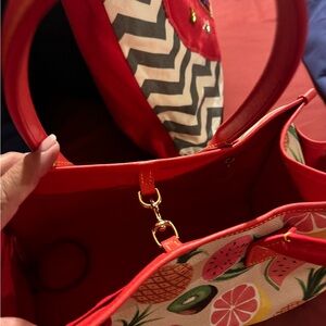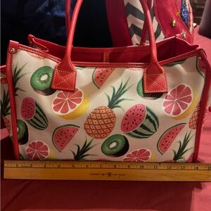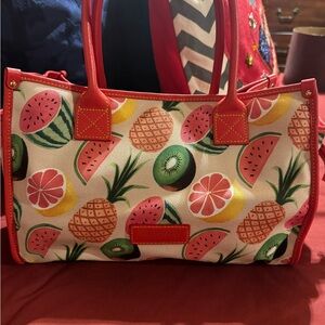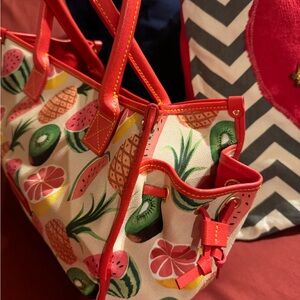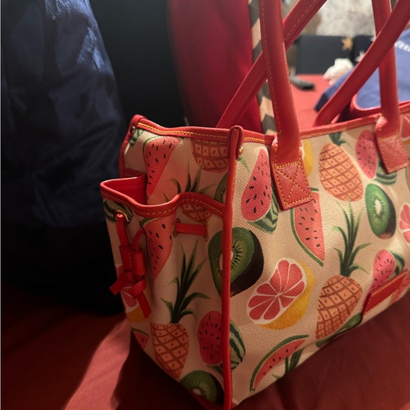 This is a Dooney and Bourke Summer handbag! It has two pockets on the outside one on each end. It has a zippered pocket inside with another flat pocket underneath and the other side to slit pockets. It also has a key strap. only used couple of times.