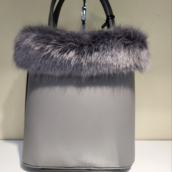This handbag is 8 in. wide , 9 in. tall and 4 in deep. The bag has faux fur around the top of it. The handbag also has a long strap inside to let you have a longer handle or to be able to make it a crossbody bag.