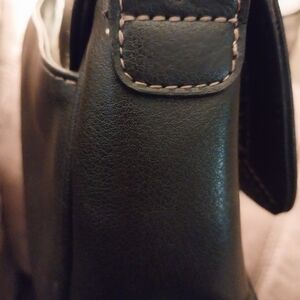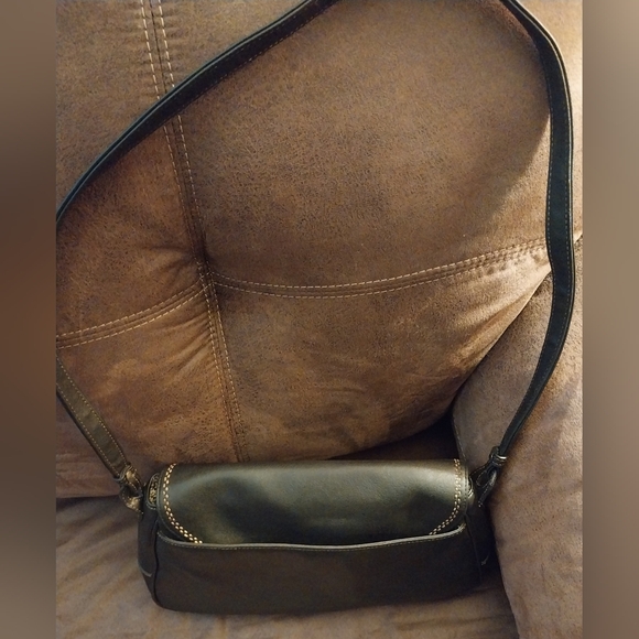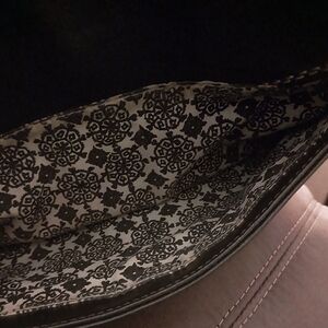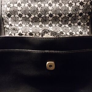 Black Liz Claiborne handbag with brown stitching and black and white flower interior. This handbag has multiple pockets and a card holder on the inside.