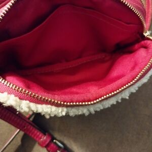 Coach pink lether, cream color trimmed handbag. The inside has a card holder and a change purse. Measurements are as follows: length 4.25 inches, width 6.5 inches, and the maximum open capacity on each side is 3.0 inches. The hang length( which is the length from the strap to the base of the handbag) is 27.5 inches.
