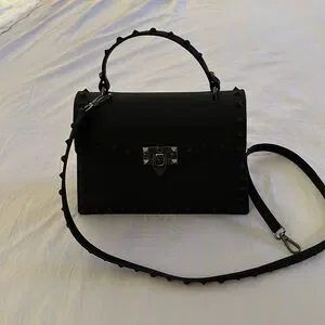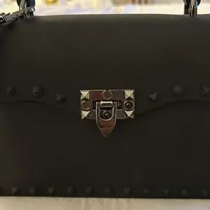 Black handbag, material is rubber, removable shoulder/ crossbody strap. Kind of fun and unique. 10” wide at bottom, 8 1/2”at the top, depth is 3 1/2”at the bottom 2 1/2” at the top.7” tall, 10” to top of handle.