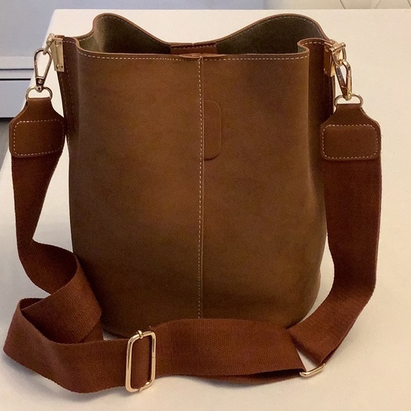Vegan suede handbag Approximately 9” x 11” Gorgeous caramel color Comes with additional strap to convert to shoulder bag/crossbody