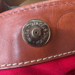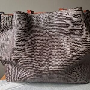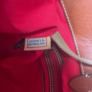 The product is a large leather tote handbag by Dooney & Bourke, featuring a brown leather handle/strap, red lining, and a snake print exterior. This stylish and spacious bag is perfect for women looking for a combination of fashion and functionality in their everyday accessories. Made from high-quality leather, this handbag exudes durability and sophistication, making it a versatile and timeless addition to any wardrobe.