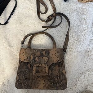 Elevate your style with this chic snakeskin pattern handbag. The tan color adds a touch of elegance to any outfit. Perfect for any occasion.