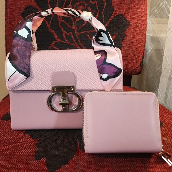 Elegant blush pink top-handle satchel featuring a structured silhouette with textured fabric upper and smooth faux-leather base. Accented with gold-tone turn-lock hardware and a removable silk-style scarf wrapped around the handle for a polished look. Comes with a matching zip-around wallet in coordinating pink. Compact yet structured design, perfect for dressy or casual outfits.