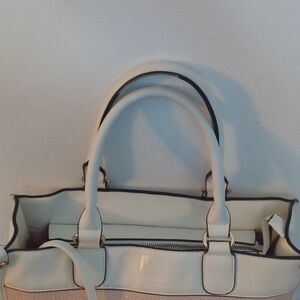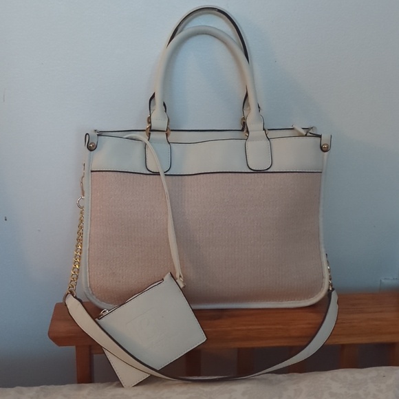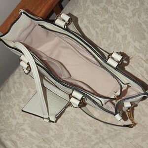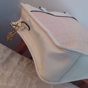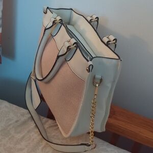 Beautiful bag in great condition except minor mark as pictured on bottom and on side. They are not much noticeable in person as in the photos. It has a change or IDs pouch attached to bag and comes with additional longer strap. The gold colored chains on straps give this bag a very luxury and unique look. It is very spacious and has 1 inner zippered section, a cellphone pouch, and another pouch for easy access to certain items.