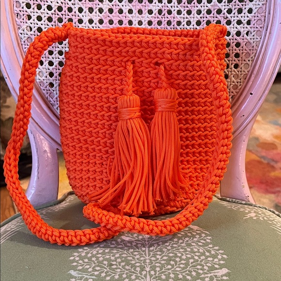 Macrame shoulder bag with tassel drawstrings. Add a pop of color to your spring wardrobe!