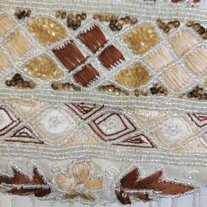 Condition: all over moderate wear - spots on inside lining, micro-tears wear the beads are sewn to the fabric (all over). Although there are several small flaws, the bag is still fully functional and in good shape.