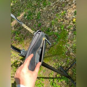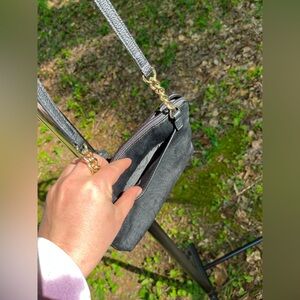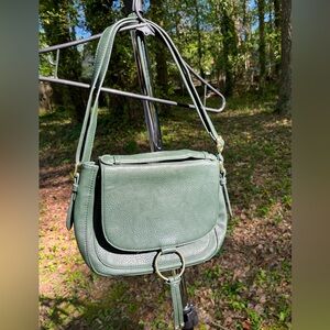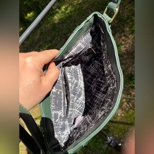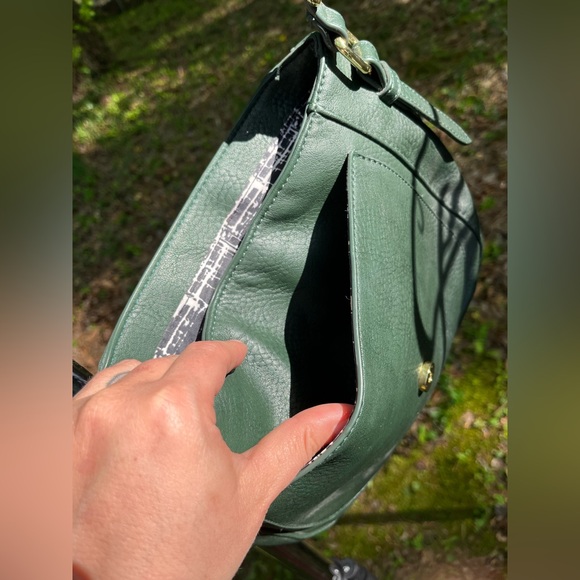 1 Dark Green Vegan Leather Cross Body Bag | Main Pocket w/ Divided Phone Pouch & Zippered Pocket | Outer Pouch | Black & White Print Lining | Circle Metal Detail | Adjustable Shoulder Strap & Hand Strap | Snap Closure | Used Like New