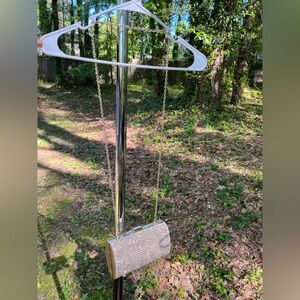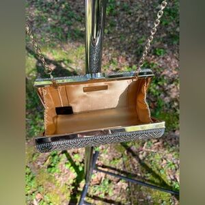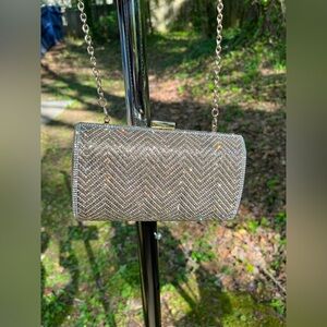1 INC Gold & White Herringbone Crystal Patterned Snap Closure Clutch w/ Gold Lining & Card Pocket | Detachable Chain Strap | Used Like New
