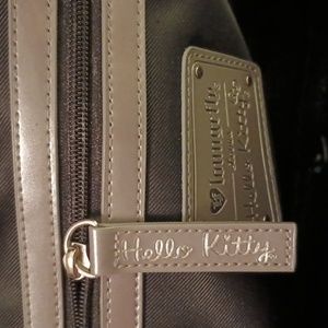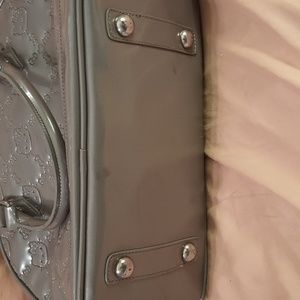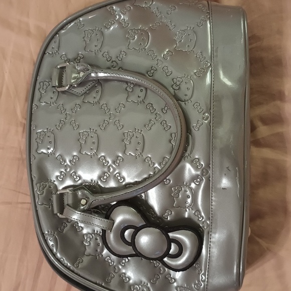 Large Hello Kitty handbag, patent leather material. Gray color, inside material is black cloth. one zip pocket and two open pockets.