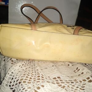 This is a Coach yellow patent leather handbag, with brown leather trimmings.