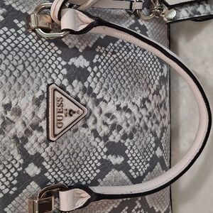 python or snakeskin handbag, zip closure, spacious main compartment, 3 slips, 1 zip pocket, 2 front/back snap pockets, 4 bottom studs, signature enameled triangle logo. front flap snap closure wallet, 14 cards slots, 2 bill pockets, ID Window, coin pocket, back exterior zip pocket, (have some markings I think it's glue) see pics, see details, EUC.