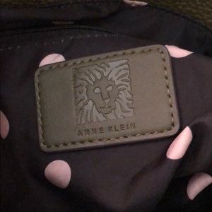 Olive green, like new Anne Klein double handle bag. Three large sections. Snap and zipper closures for added security.
