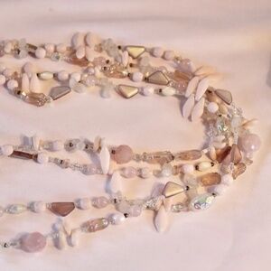 New Handbeaded using assorted mixed beads in whites and pale pinks, 30 inches long flat. Toggle clasp. Beautiful necklace designed by Doe Hart for Doebee Designs. Would look nice with the wrap wire bracelet in mixed whites also by Doe Hart.