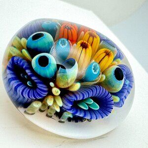 The intricate design of this handblown glass pendant evokes the vibrant beauty of an ocean reef. With a kaleidoscope of colors and meticulous craftsmanship, it serves as a unique statement piece. Ideal for collectors and art enthusiasts seeking a blend of creativity and elegance in wearable art.