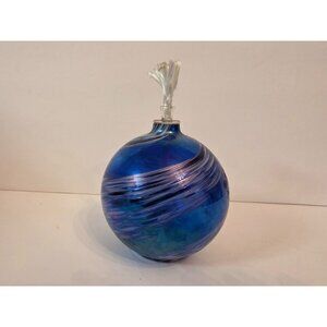 An elegant handblown glass oil lamp with a swirling iridescent design featuring blue and purple hues. Functional yet artistic home décor piece.
