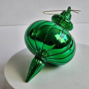 Add timeless elegance to your seasonal décor with this handblown art glass ornament. Measuring approximately 5.75" tall and 3.5" wide, this piece features a rich emerald green reflective finish with a classic finial silhouette. The ribbed detailing and glossy surface give it a luxurious, heirloom-quality look, perfect for those who love vintage-inspired, old-world, or maximalist Christmas décor.