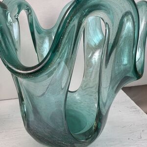 These stunning candle holder sculpture is a true work of art. Handblown from high-quality glass, it features a beautiful aqua color with gold accents. The abstract design makes it a unique and eye-catching addition to any home decor.