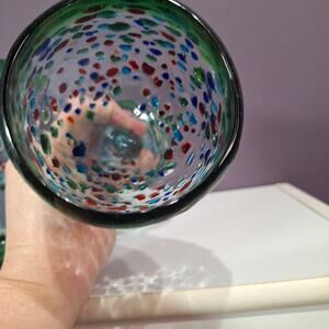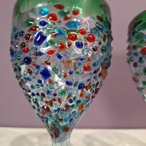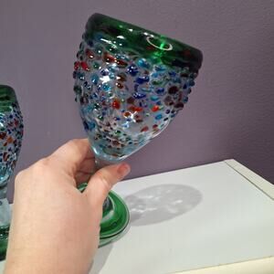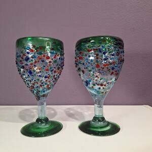Hand-blown thick confetti glass wayer goblets set of 2 green blue speckled