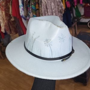 I have burned a beautiful dandelion puff design into a light blue felt woman's hat