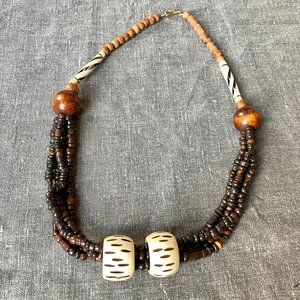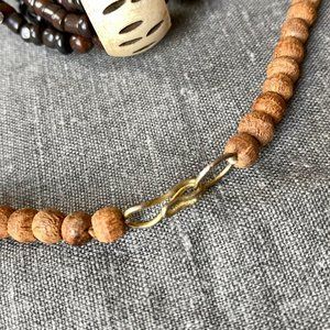 Two large accent beads w/ 2 pipe beads, string with wood beads. Hook closure.