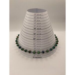 This necklace features handcrafted paper beads in vibrant green, accented with a unique bead. It measures 25 inches and offers a unique, eco-friendly accessory choice that adds a sustainable touch to your ensemble.