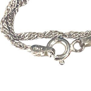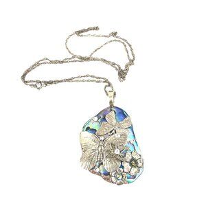 This exquisite necklace features a handcrafted abalone shell pendant adorned with delicate silver butterflies and floral motifs. Its iridescent hues captivate with every turn, making it a captivating piece of jewelry art. Crafted in Italy, this necklace exudes elegance and timeless beauty, a testament to fine craftsmanship. The intricate details and shimmering beauty of the abalone shell create a stunning visual appeal, ensuring it's a conversation starter at gatherings.