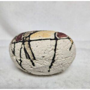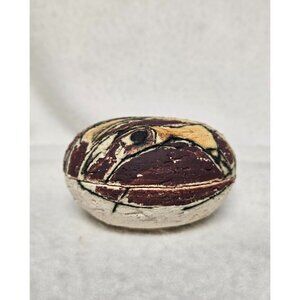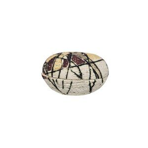 Handcrafted abstract ceramic trinket box, egg-shaped with a snug lid. Beautiful earth tones of beige and red enhance its appeal. Perfect for storing small treasures.