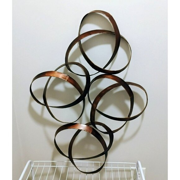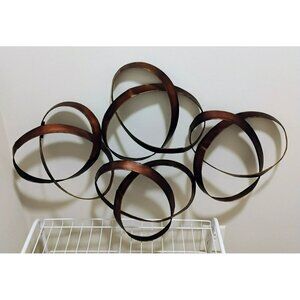 This abstract wall sculpture features interwoven metal loops with a rustic bronze finish, adding an artistic and dimensional statement to any interior space. Its handcrafted design and unique aesthetic make it a focal point of elegance and artistry, blending seamlessly with a variety of décor styles.