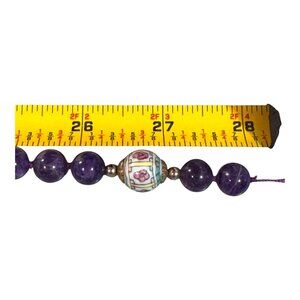 Elevate your jewelry collection with this exquisite artisan necklace that seamlessly blends natural beauty and intricate craftsmanship. The deep purple amethyst beads create a regal backdrop for the stunning hand-painted porcelain focal bead, featuring delicate floral and leaf motifs in soft green and pink hues. Each carefully selected amethyst sphere showcases rich, translucent color and natural variations, while metallic accent beads add a touch of refined elegance. This unique piece tells a story of traditional artisanship, bridging contemporary style with timeless design.