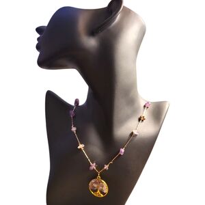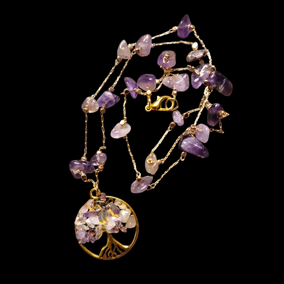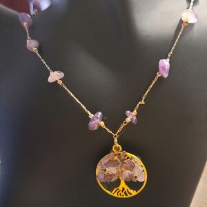 โจ Features a gold-toned tree of life pendant adorned with natural amethyst chips.
