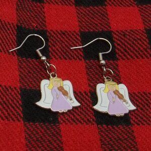 The metal Angel charms hang from a silver tone fish hook wire and are approximately .75 of an inch wide and .75 of an inch long. The earrings are approximately 1.5 inches long from where the wire would naturally hang in the ear lobe to the bottom of the Angel charm.