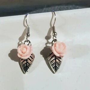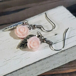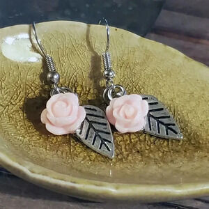 Handcrafted Antique Silver Leaf Light Pink Lucite Rose Dangle Earrings