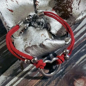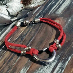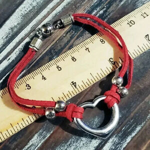 Handcrafted Antique Silver Red Vegan Suede Open Heart Magnetic Clasp Bracelet