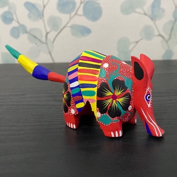 Beautiful, vibrant and colorful hand carved and painted armadillo Alebrije figurine.