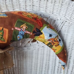 Crescent shaped, handcrafted "scarecrow" wreath using mixed media - fabric, burlap, raffia, felt, buttons, wood, and faux berries and leaves