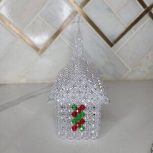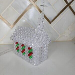 This meticulously handcrafted beaded church ornament is an exquisite addition to any festive décor. Made with clear, red, and green beads, it features intricate detailing, complete with a cross on the steeple and charming Christmas garland. Perfect for adding a touch of holiday spirit to your home, this unique piece showcases craftsmanship and elegance.
