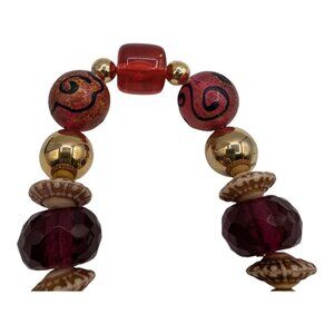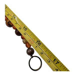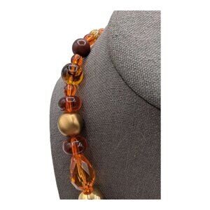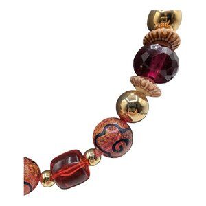 Handcrafted beaded necklace with gold, amber, and red beads. Measures 16 inches long.