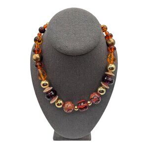 Handcrafted beaded necklace with gold, amber, and red beads. Measures 16 inches long.