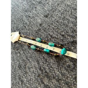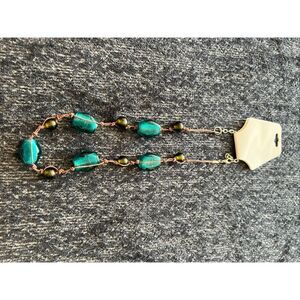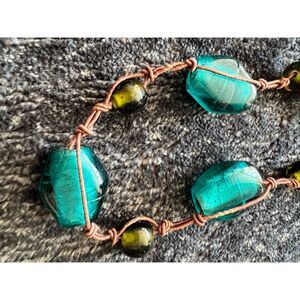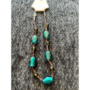 This is a handcrafted necklace featuring turquoise and green beads. The piece is strung on a copper wire and includes a lobster clasp for closure. The one turquoise bead does have a small chip as pictured.