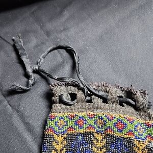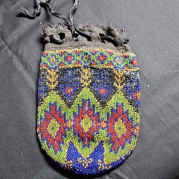 Antique beaded pouch features a vibrant multicolor design. The beading is in very good condition. The satin tie string is not. Interior of bag is intact. Overall a beautiful bag.